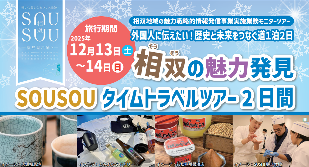 相双地域は、2011年の東日本大震災で大きな被害を受けましたが、現在は震災を乗り越え、地域の復興と再生に向けて力強く歩みを進めている地域です。本ツアーでは、陶器の絵付け体験や味噌づくり体験、寿司の握り体験に加え、ワイナリーでの試飲など、伝統工芸や地域産業を体感できる多彩なプログラムをご用意しています。これらの体験を通して、外国の方々にも日本の文化と地域の魅力を知っていただける、貴重で魅力あふれるツアーとなっております。