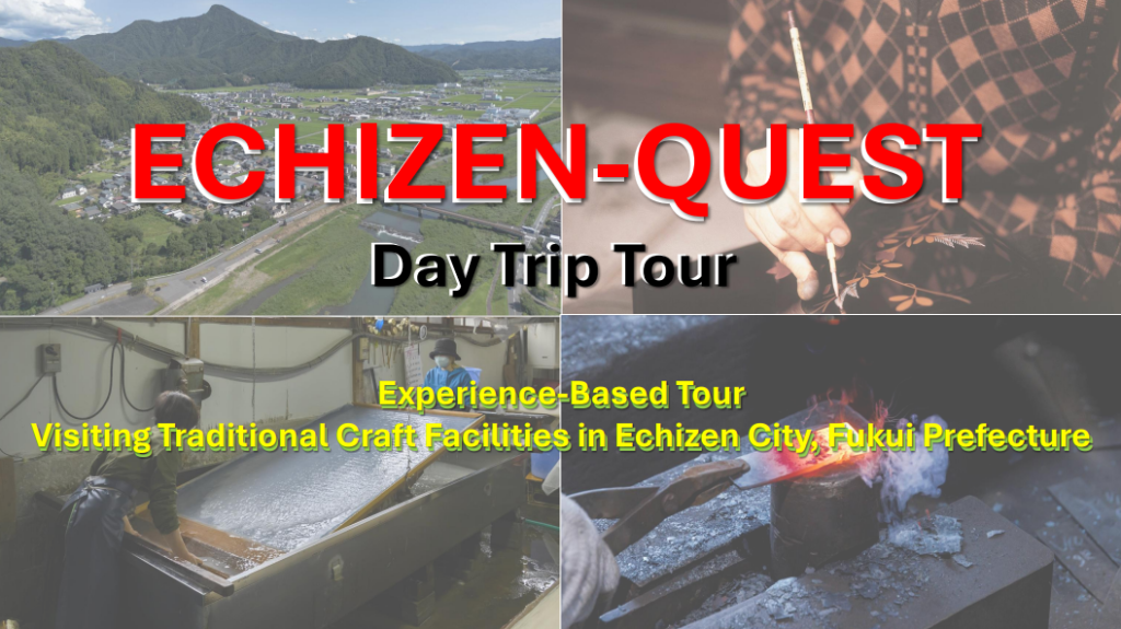 “ECHIZEN-QUEST” is a one-day tour where you can experience five traditional crafts of Echizen City —washi paper, lacquerware, forged blades, bamboo work, and Echizen pottery— along with two manufacturing industries that Fukui Prefecture is proud of: eyeglasses and textiles.